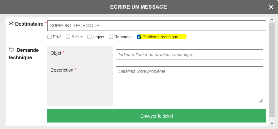 Vous avez la possibilité d'envoyer une demande technique au support du logiciel Serenovia.
