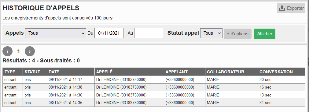 Vous avez besoin d'un enregistrement d'appel ? N'hésitez pas à demander à votre secrétariat. Ils sont conservés 100 jours, au-delà ils sont supprimés définitivement.