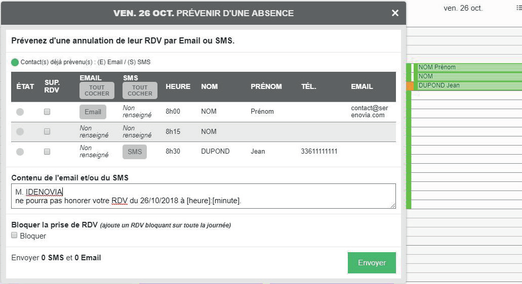 Votre secrétariat peut prévenir vos patients rapidement par email et/ou SMS grâce à la fonctionnalité "Prévenir d'une absence / d'un retard" du logiciel.